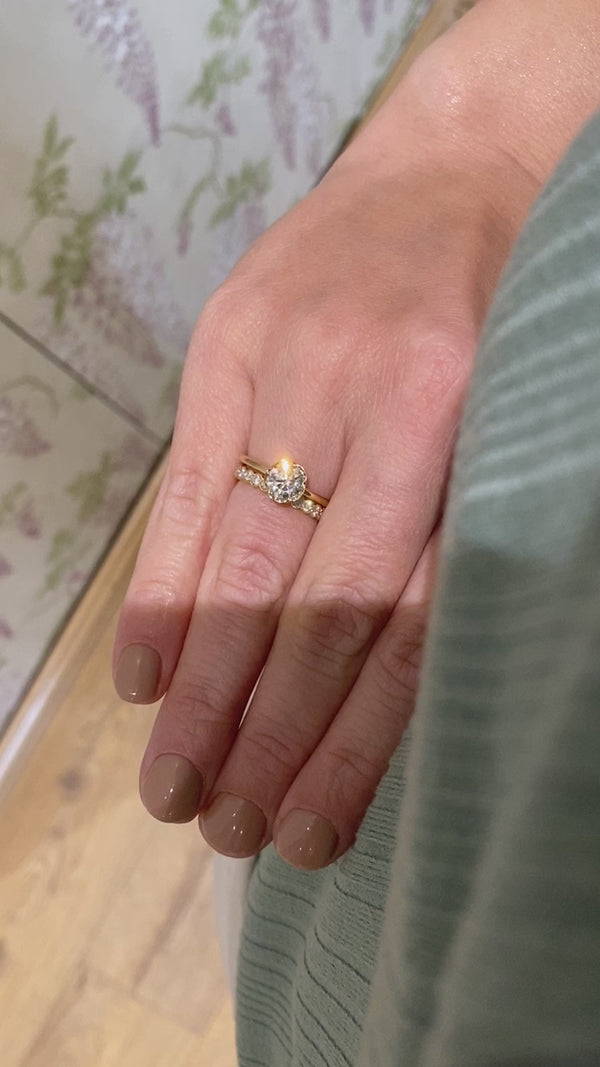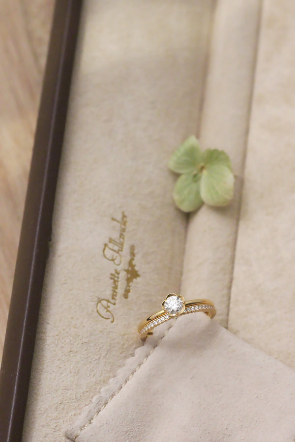 Hennot terälehdet avaavat istutuksen, tehden siitä näyttävämmän kuin tavallinen reunaa kiertävä istutus – ja luoden herkän, elegantin kokonaisuuden. Kaunis yksinään, mutta sopii myös yhdistettäväksi muiden sormuksien kanssa. Paola Flower on saatavana soikealla luonnontimantilla sekä LAB-synteettisillä timanteilla, ja Paola Flower Fancy -malliin voit valita ihanan värillisen jalokiven.