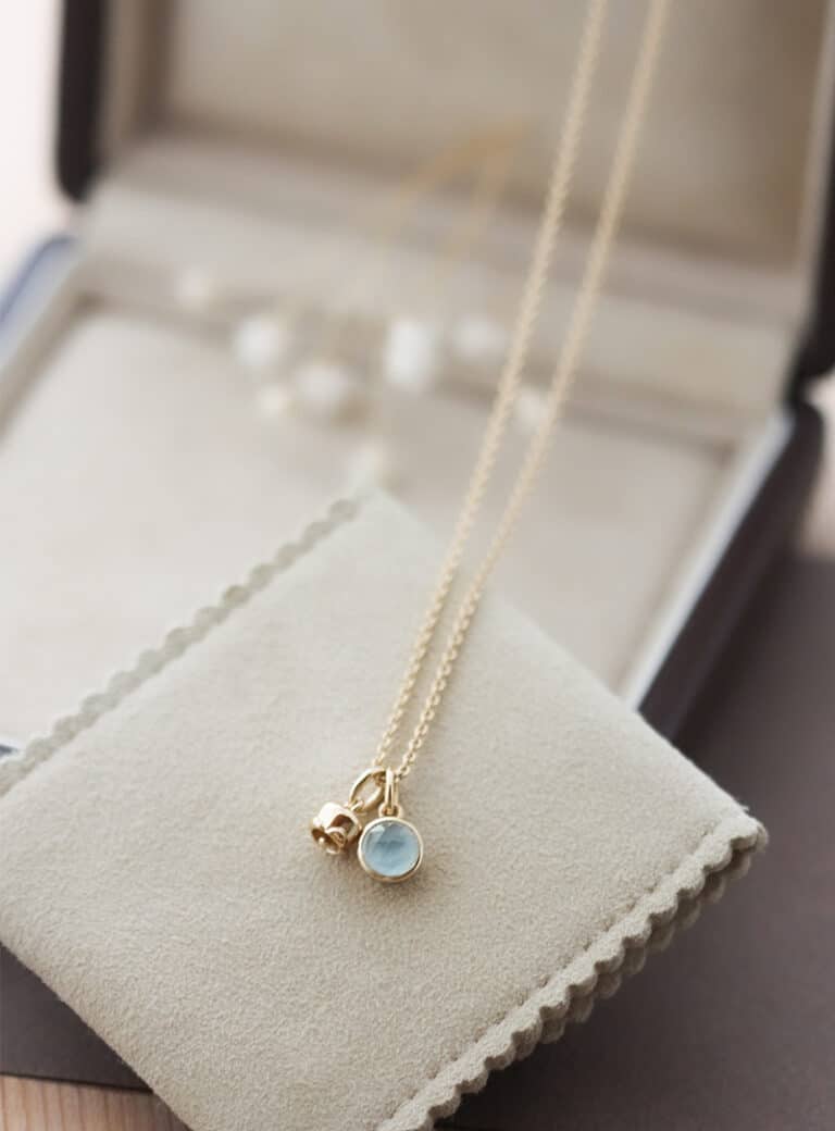 The Lily of the Valley Baby pendant and the aquamarine Ordinary Rose pendant create a beautiful, delicate ensemble.