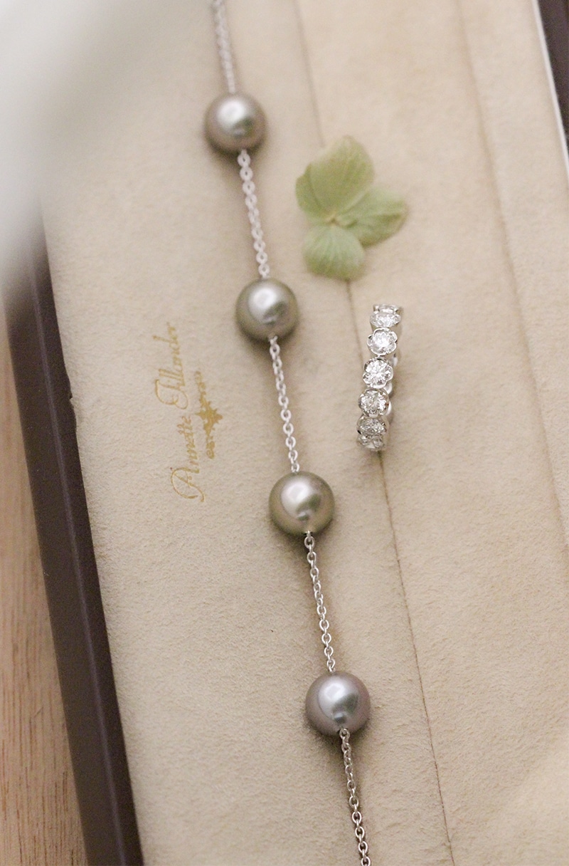 MINA PÄRLOR helmirannekoru 18k valkokultaa Ihania erivärisiä Tahitinhelmiä